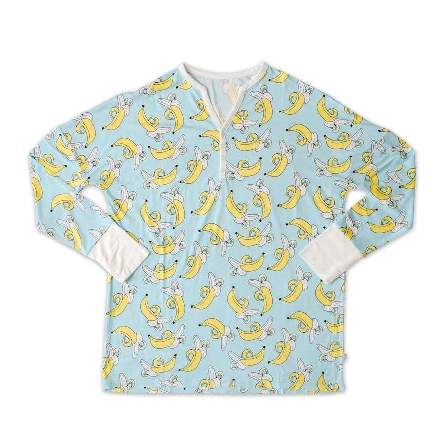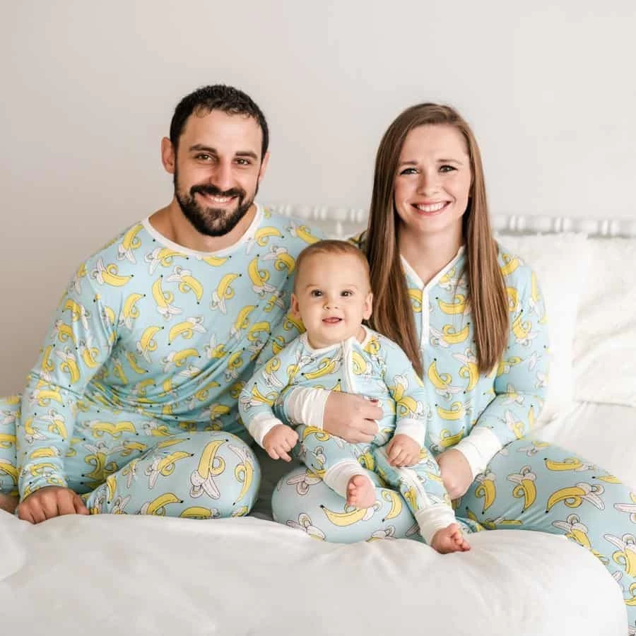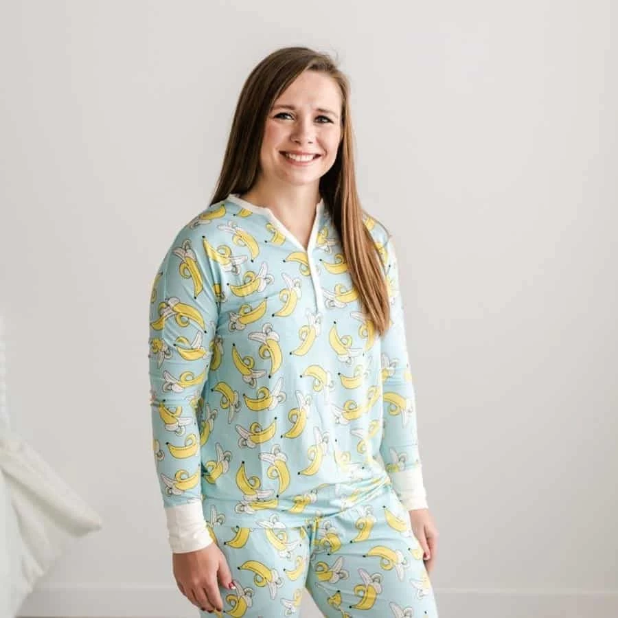 Experience the buttery softness of Little Sleepies for yourself! Matching baby and kids styles available here. The pop of bright yellow bananas really stands out on the beautiful blue background with white trim accents, making it one of our favorite signature prints.