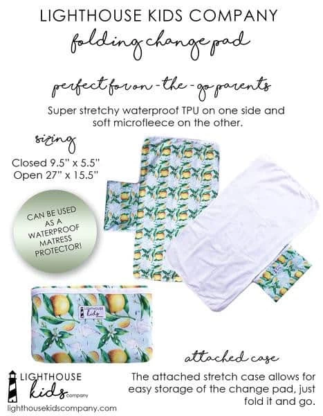 The Lighthouse Kids Company Fold Change Pad is perfect for the on-the-go parent! This flexible changing pad can be used while traveling and as a mattress protector. It’s the perfect accessory for the cloth diapering parent!