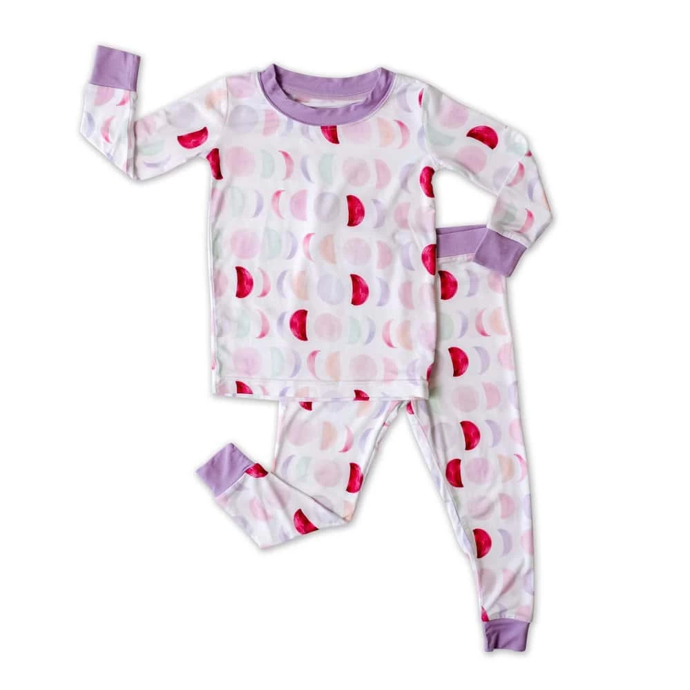 Goodnight moon. What better way to help your little sleepy drift asleep than to put them in a super soft gown covered in beautiful watercolor moons? Gorgeous shades of pink, magenta and mint are accented by a pretty Wisteria trim.