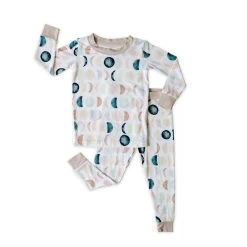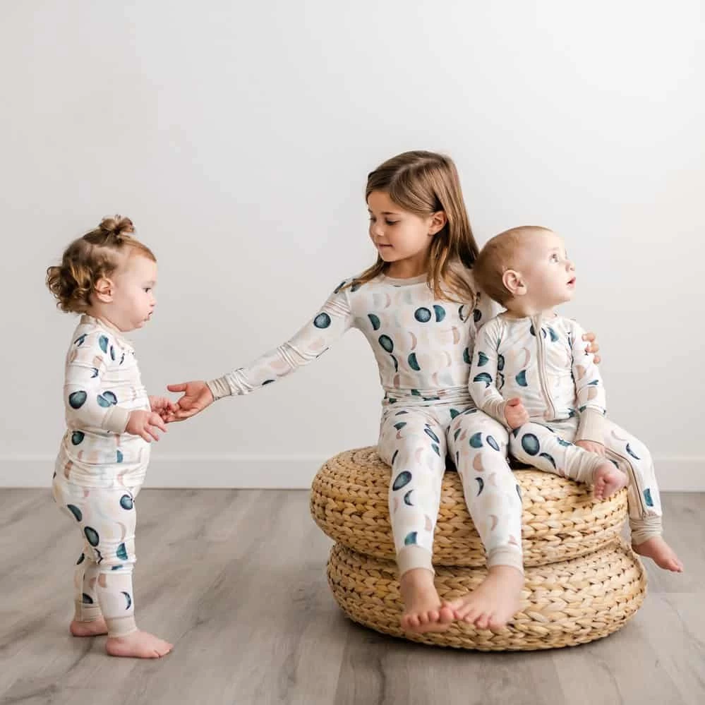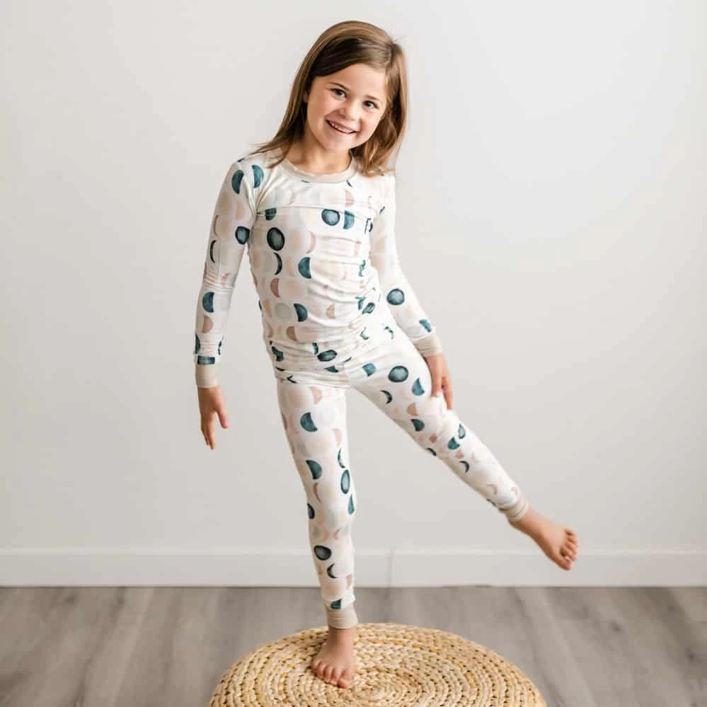 Just like the moon, our littles go through so many phases in life. Celebrate each stage with this gorgeous neutral moon phases print. Shades of tan and blue adorn the background of this pajama set with the perfect tan trim!
