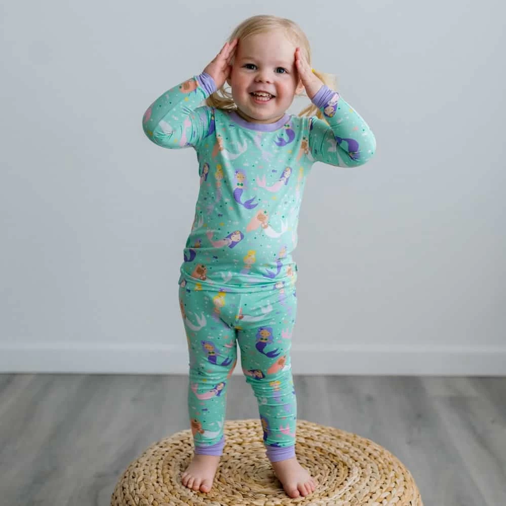 Comfy for them. Easy for you. The best sleepwear (or all day wear) around for your little ones.This set features the sweetest mermaid print (not to mention crabs, turtles, seahorses, etc!). Now for the details: