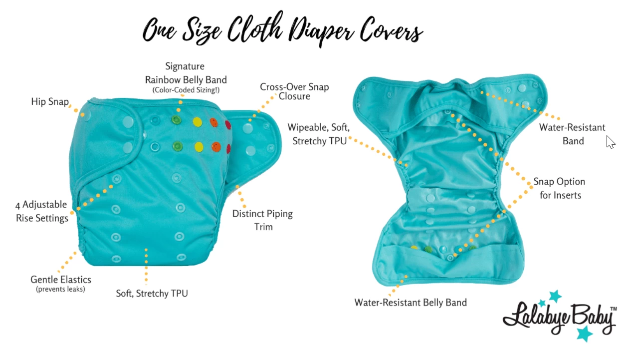 Lalabye Baby Diaper Covers are made from the same material as our One Size Diapers: lightweight and water-resistant fabric (TPU) with a laminated interior that can be easily wiped clean/dry and re-used immediately. The softly bound leg and back elastics are great for babies with sensitive skin, and set the look of our Covers apart from our One-Size Diapers. Adjustable to fit your baby or toddler ranging from 8-35 lbs, the cover is a water-resistant shell that can be used for any time of day and for several activities such as sleeping, swimming, or even potty training!